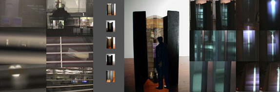 It consists of an 8-foot reflective prism, louan walls and video projections modulated by proximity sensors. Created for Parsons New School for Design MFA Thesis (2001).